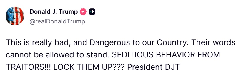 Trump seized on the message as a direct attack on his authority, branding the lawmakers «traitors» engaged in «SEDITIOUS BEHAVIOR» and using his Truth Social feed to demand their arrest and hint that their actions should be «punishable by DEATH!».